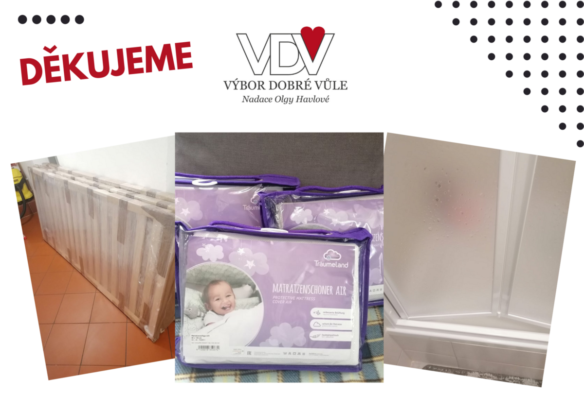 Tímto bychom chtěli poděkovat nadaci Výbor dobré vůle - Nadace Olgy Havlové za finanční dar 18 000.-, který nám byl poskytnut v rámci programu Obyčejný život, díky kterému jsme mohli zakoupit chrániče na matrace pro miminka, rošty do postelí a zástěnu do sprchového koutu. Děkujeme za Vaši podporu !